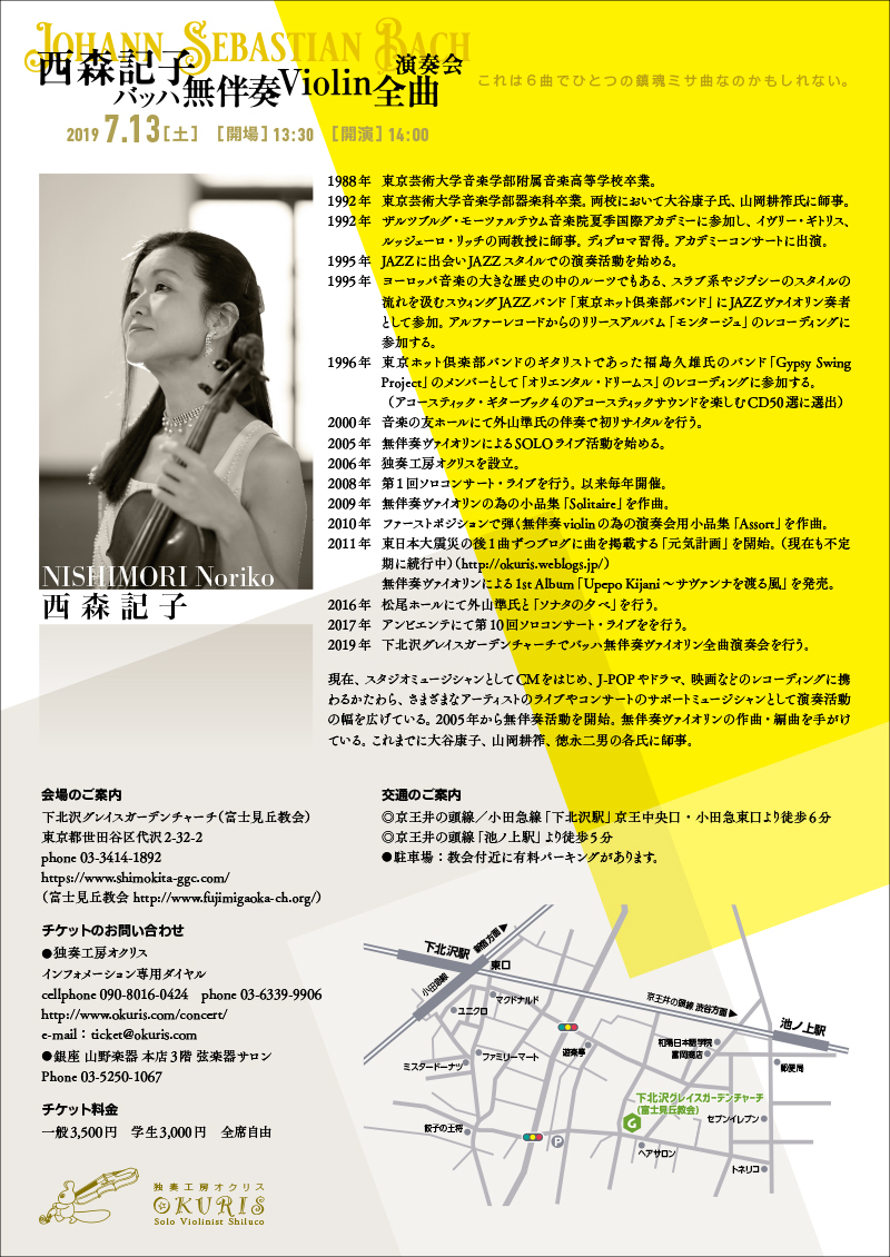 [チケットのお問い合せ]◎独奏工房オクリス・インフォメーション専用ダイヤル : 03-6339-9906e-mail:ticket@okuris.com ◎銀座 山野楽器 本店3階 弦楽器サロン : 03-5250-1067
